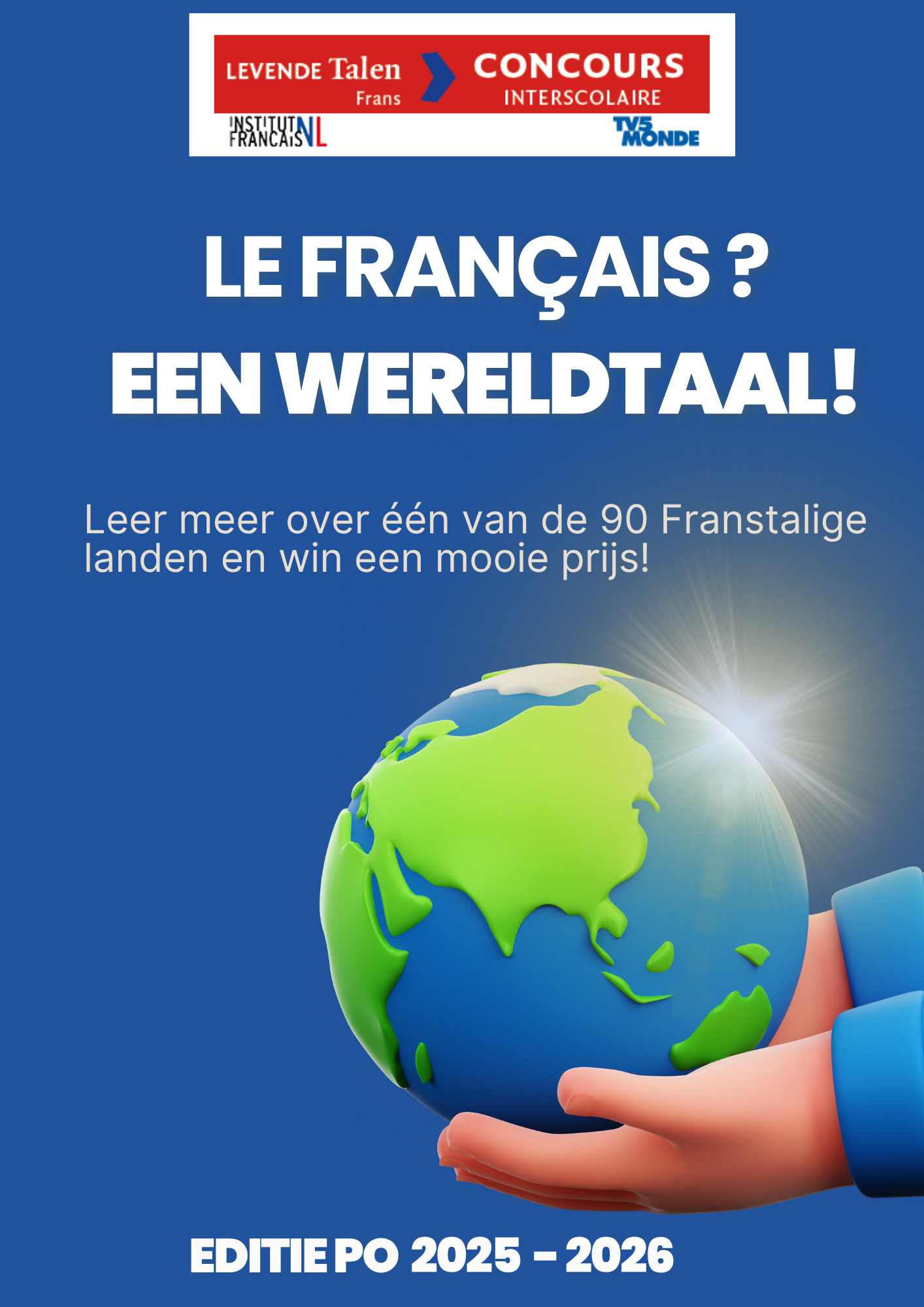 In nauwe samenwerking met het Institut Français Nederland, en gesponsord door TV5MONDE, organiseren we ook dit schooljaar weer een concours interscolaire voor vo, mbo én po. De opdracht is voor alle categorieën gelijk maar voor leerlingen in het basisonderwijs zijn de eisen natuurlijk iets anders geformuleerd. Inschrijving vooraf is niet nodig. Alle inzendingen moeten ontvangen zijn op of vóór 22 mei 2026.